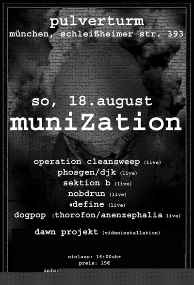 Wie es der Zufall so wollte weilte ich gerade, mehr oder wenig zufällig, in der Nähe von München, wodurch sich mir die Gelegenheit gab dem Munization Festival beizuwohnen, in dessen Rahmen die Projekte define, nobdrun, sektion b, phosgen/djk , operation cleansweep und dogpop(kollaboration zwischen Thorofon und Anenzephalia) auftraten und Dawn Projekt das ganze mit einer Videoinstallation untermalten . Nach einer kleinen Irrfahrt gelang es mir endlich den so genannten Pulverturm Klub zu finden, ein unscheinbares Häuschen in einem Industriegebiet am nördlichen Stadtrand von München. Leider hatte ich keinen Flyer zur Hand und musste bei meinem Eintreffen feststellen, dass das Festival 20.30 Uhr schon in vollem Gange war, was mich um den Genuss von Define und der Videoinstallation von Dawn Projekt brachte. Der Einlass war übrigens schon um 16 Uhr!!!! Der Klub an sich war sehr übersichtlich; nach einem kleinem Raum im Eingangsbereich, kam man gleich in den Hauptbereich mit der Bühne nach vorne heraus und der Bar im Rücken. Neben der Bühne befand sich noch ein Ausgang in den Hinterhof, wo noch Volker vom Eternal Soul Label aus Berlin eine kleine Auswahl an Tonträgern anbot und man vor dem Dunst und der stickigen Luft im Konzertraum in die laue Sommernacht flüchten konnte.