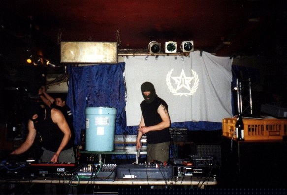 Danach traten DJK und Phosgen, eine Kollaboration beider Projekte, auf. Gewohnt mit Sturmhauben bekleidet, boten sie ein geladenes Set mit harschen noise Attacken und powerelektroniksound wie man ihn schon von ihren Tonträgern kennt. Für Abwechslung sorgten die Musiker, neben dem wohl mittlerweile etwas betrunkenen Verantwortlichen, der für die unkoordinierten Projektionen zuständig war, durch einen großen Metallbehälter, welcher mit Mikrophon und Metallstab bearbeitet, gekonnt in die Erzeugung der Klänge einbezogen wurde und für Bewegung und nicht statischer Langeweile auf der Bühne sorgte.