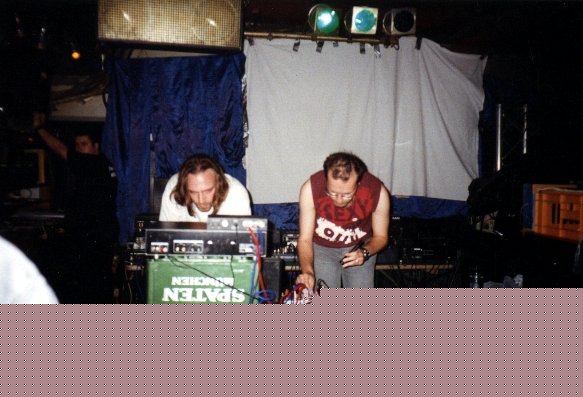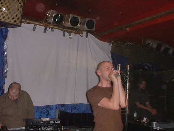 Als ich nun die Lokalität geentert hatte, waren gerade Nobdrun am Aufspielen, welche, wohl da sie ja aus der Region stammen, vom einem größeren Teil des anwesenden Publikums frenetisch gefeiert wurden. Mich beeindruckte ihre Mischung aus verzerrten Beats, Breakbeats und harscher Elektronik mit verzerrtem Gesang a la Wumpscut allerdings nicht sonderlich. Nach dem Auftritt von Nobdrun, welcher sich leider noch etwas hinzog und einer etwas längeren Umbaupause, wie sie für diesen Abend typisch werden sollte, trat das Projekt dogpop einer Kollaboration aus je einem Anenzephalia Mitglied und einem Mitglied von Thorofon. Als musikalische Kost wurden minimale Elektronik mit leichten Technoanleihen und teilweise verzerrten Sounds geboten, welche bei mir durchaus Gefallen fanden. Im Hintergrund lief zur visuellen Untermalung des Auftritts ein nettes und recht unterhaltsames, gesellschaftskritisches Filmchen mit Fragmenten aus Trick- und Werbefilm. Auf meine Anfrage, ob man schon konkreteres für die Zukunft plane, wollten sie sich noch nicht festlegen, zeigten sich aber auch nicht gänzlich abgeneigt.